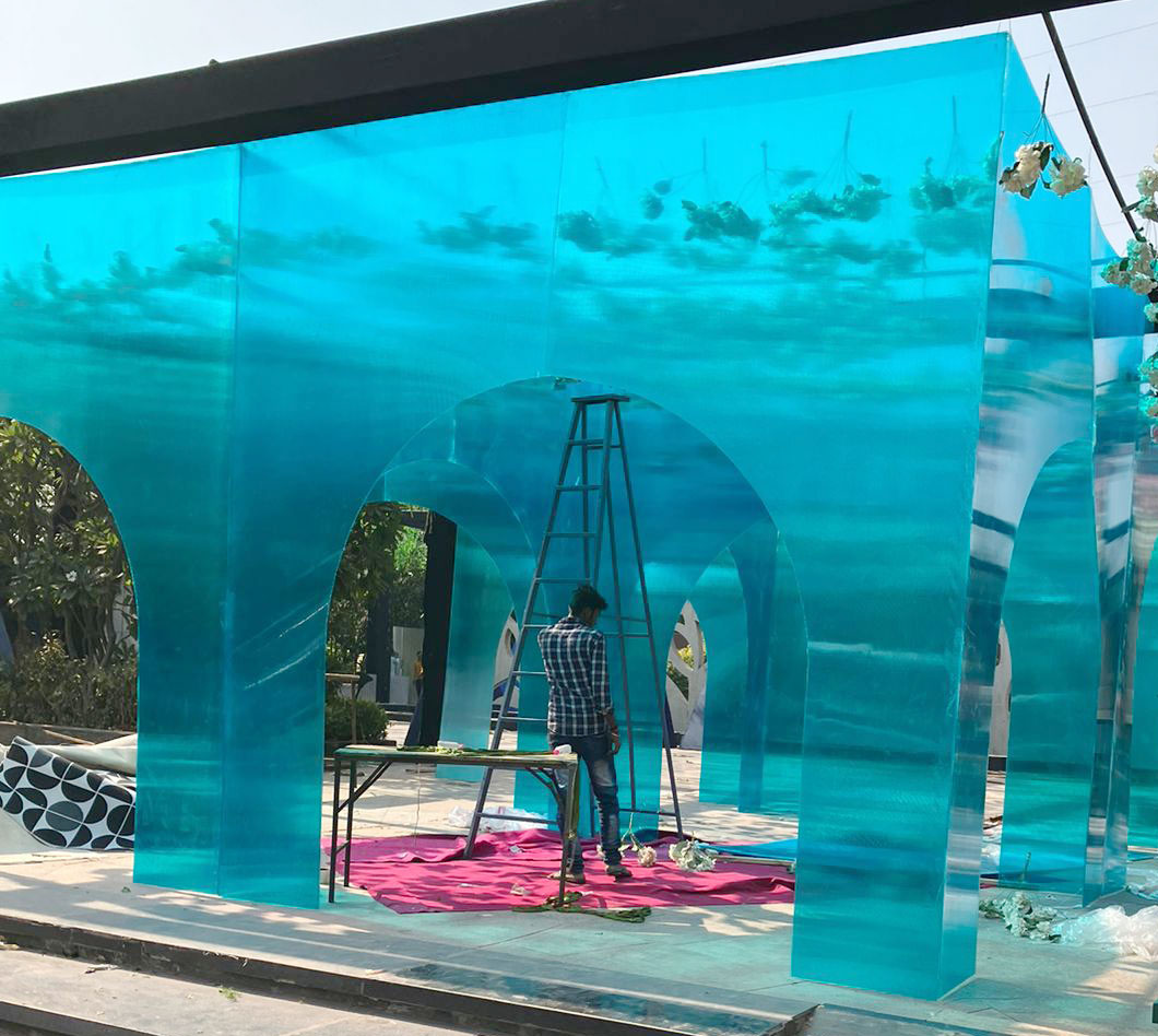 This season, translucent polycarbonate sheet set decoration is creating a buzz around. Wooden or cloth set decorations are out of fashion now. Wedding passage made from greenish blue Tilara Polycarbonate Sheet (see in the picture) is a vogue. It’s good news for wedding decorators looking for something new to design or new material for the decor. You can make your extravagant affair enhanced for photography and wow the guests with a translucent set decorated with Tilara Polycarbonate Sheet.